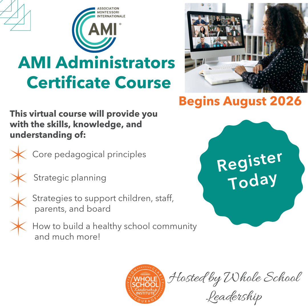Are you in search of a comprehensive administrators training to support and deepen your understanding of school leadership within a Montessori pedagogical context? The AMI Montessori Administrators Certificate Course is open to anyone interested in developing their Montessori leadership skills and will provide you with the skills, knowledge and understanding of: